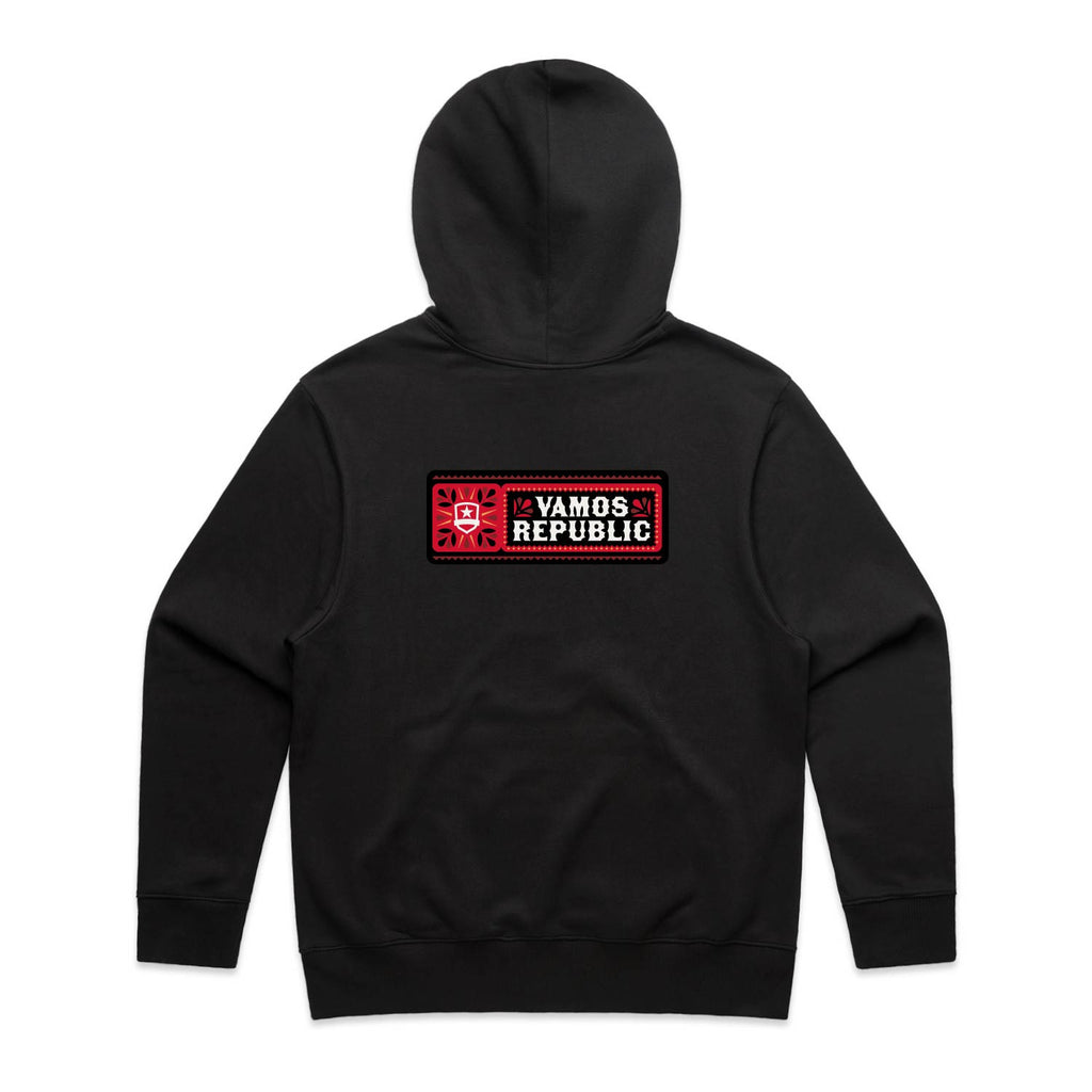 Celebrate culture, passion, and fútbol pride with the Vamos Republic Hoodie. This bold black hoodie features a vibrant front graphic inspired by traditional papel picado, blending artistic heritage with Sacramento Republic FC spirit. The red and white design showcases the phrase “Vamos Republic” alongside the club’s signature shield an electrifying rallying cry for all fans!