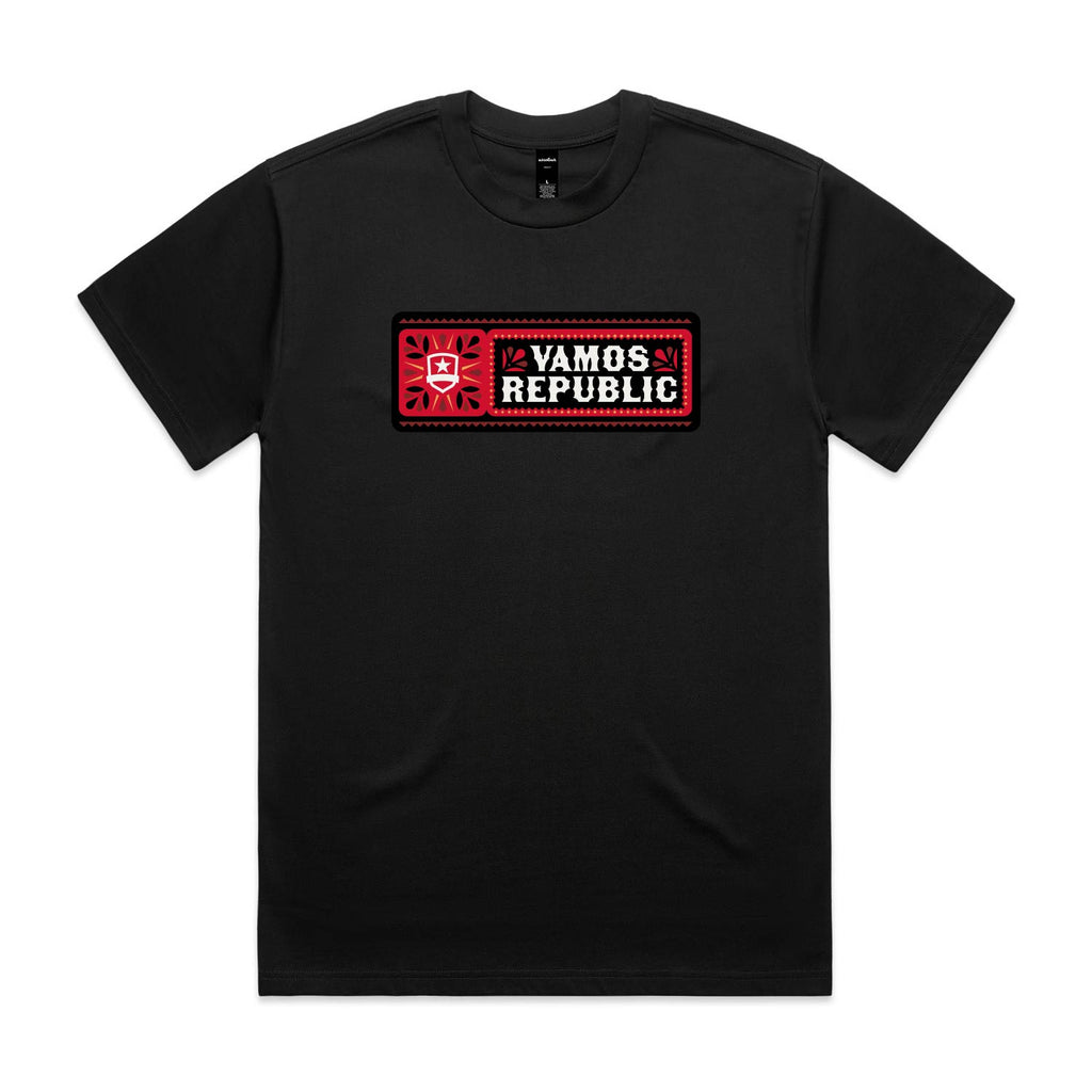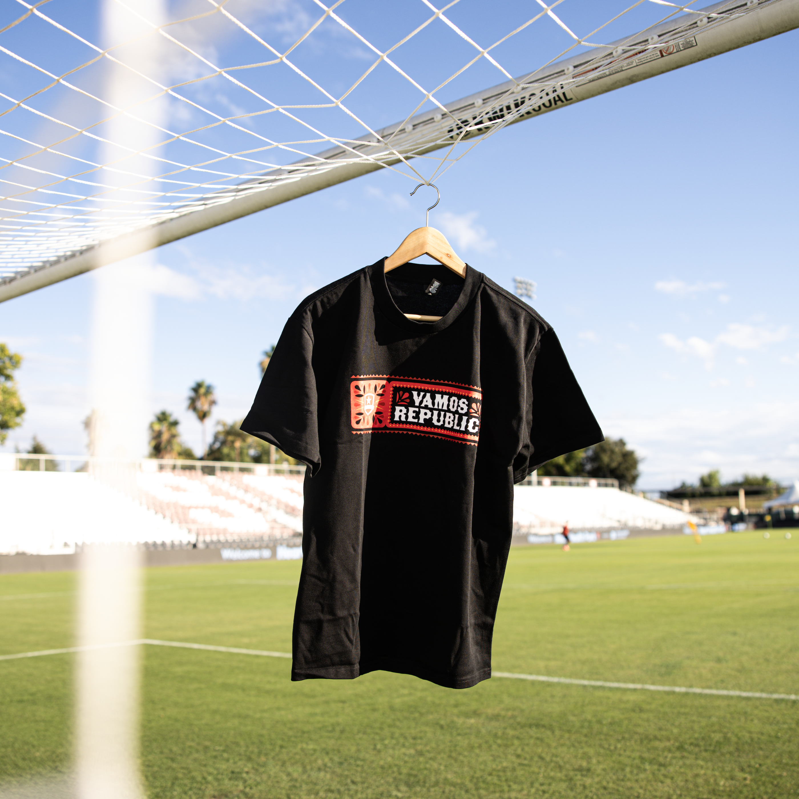 Celebrate culture, passion, and fútbol pride with the Vamos Republic Tee. This bold black shirt features a vibrant front graphic inspired by traditional papel picado, blending artistic heritage with Sacramento Republic FC spirit. The red and white design showcases the phrase “Vamos Republic” alongside the club’s signature shield an electrifying rallying cry for all fans