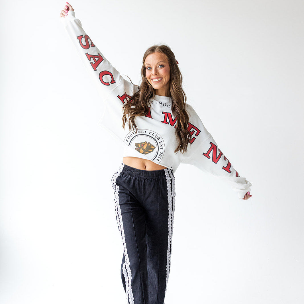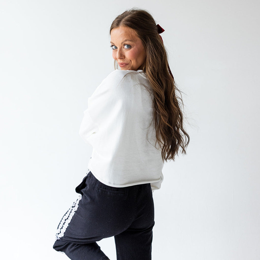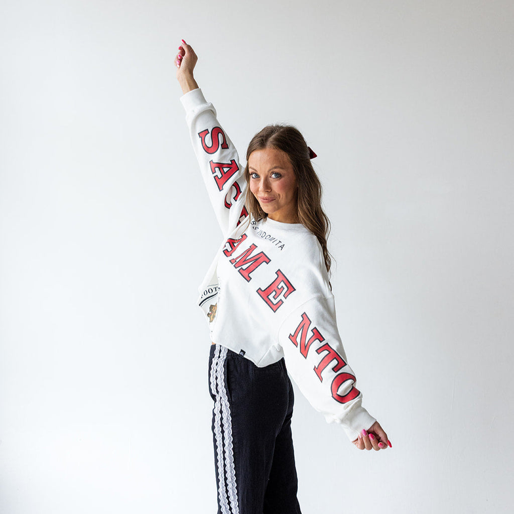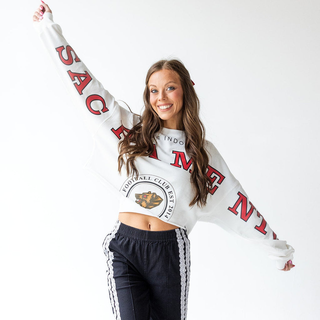 Our Cropped Long Sleeve Crewneck! A GDS favorite featuring a raw hem, dropped shoulder, and the perfect lightweight material. It fits like a dream and adds a girly touch to your collegiate wardrobe. Pairs well with denim shorts and cowboy boots for game day!
